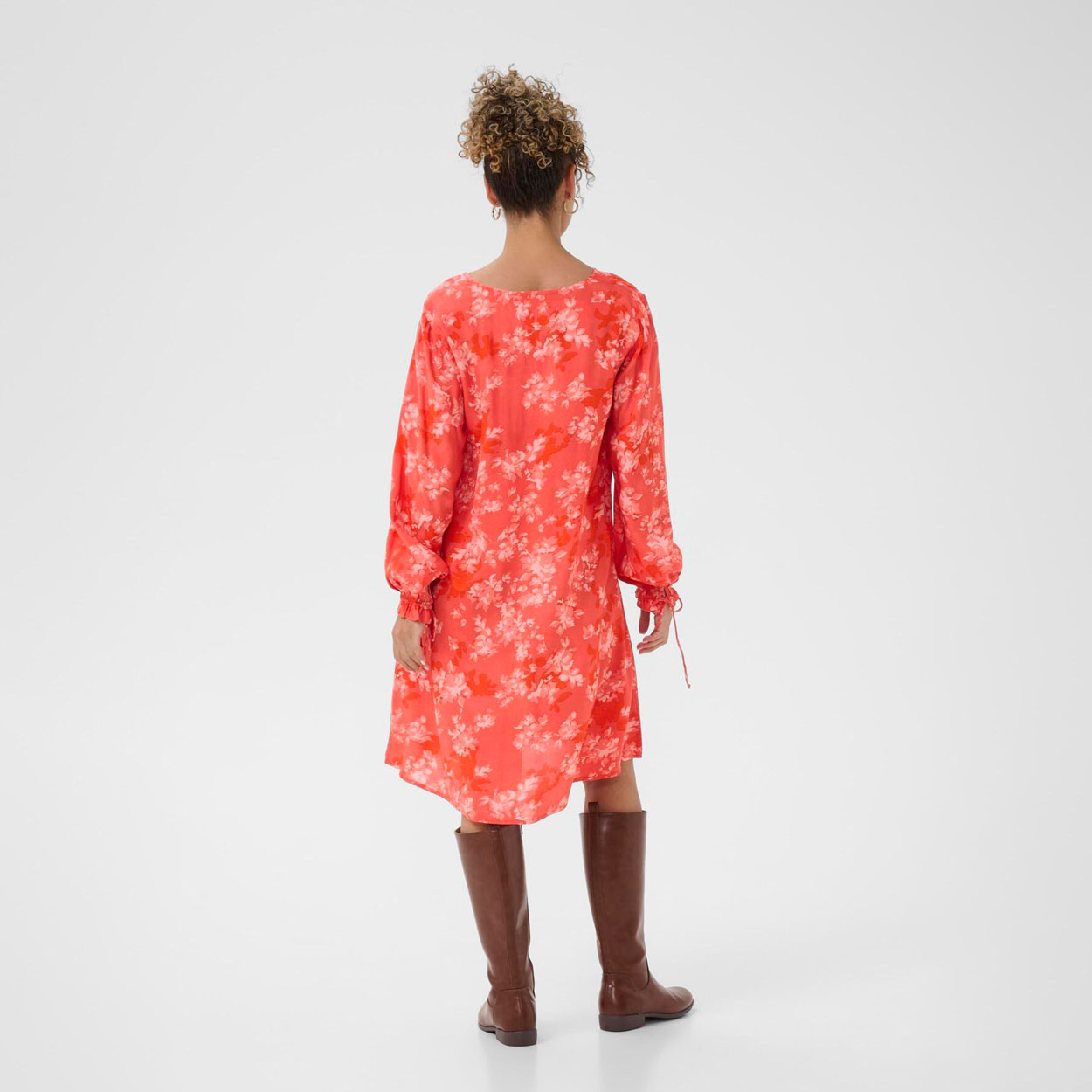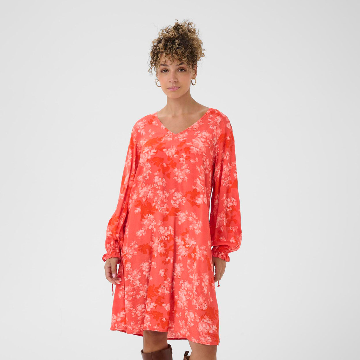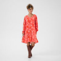 Cream tyylikäs mekko arkeen ja juhlaan. Ihanan pehmeä kangas ja kaunis kukkakuvio. Pohjaväri on punainen ja koristeena kauniita vaaleampia kukka kuvioita. Cream mekko kauniisti A-linjainen, mekossa on V-kaula-aukko. Hihan suissa on kiristys nauhat.