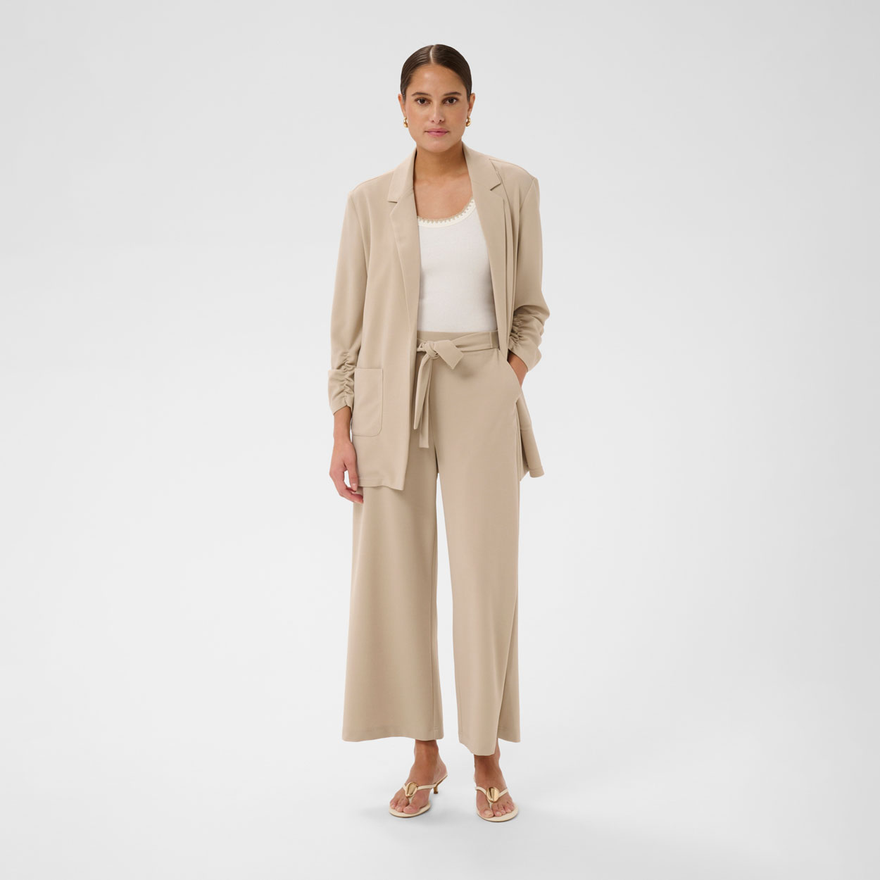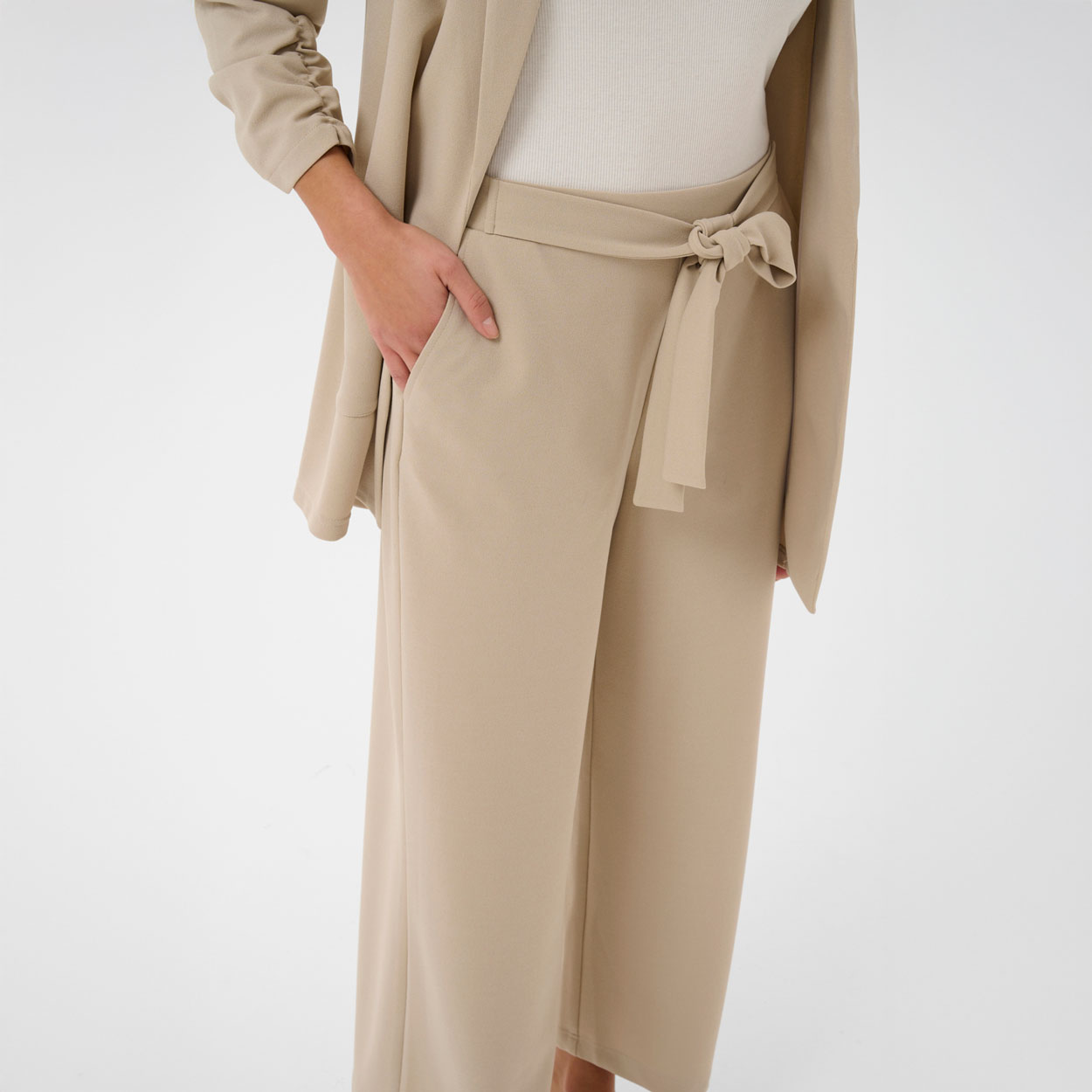 Kaffe upeat housut, leveällä lahkeella. Kaffe housussa on vajaamittaisella lahkeella. Housussa on kuminauhavyötärö ja kiinteä samasta kankaasta vyö. Phoebe housun kanssa sopii hyvin Phoebe bleiseri.