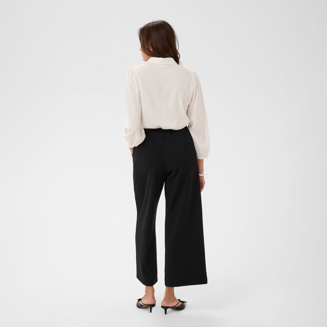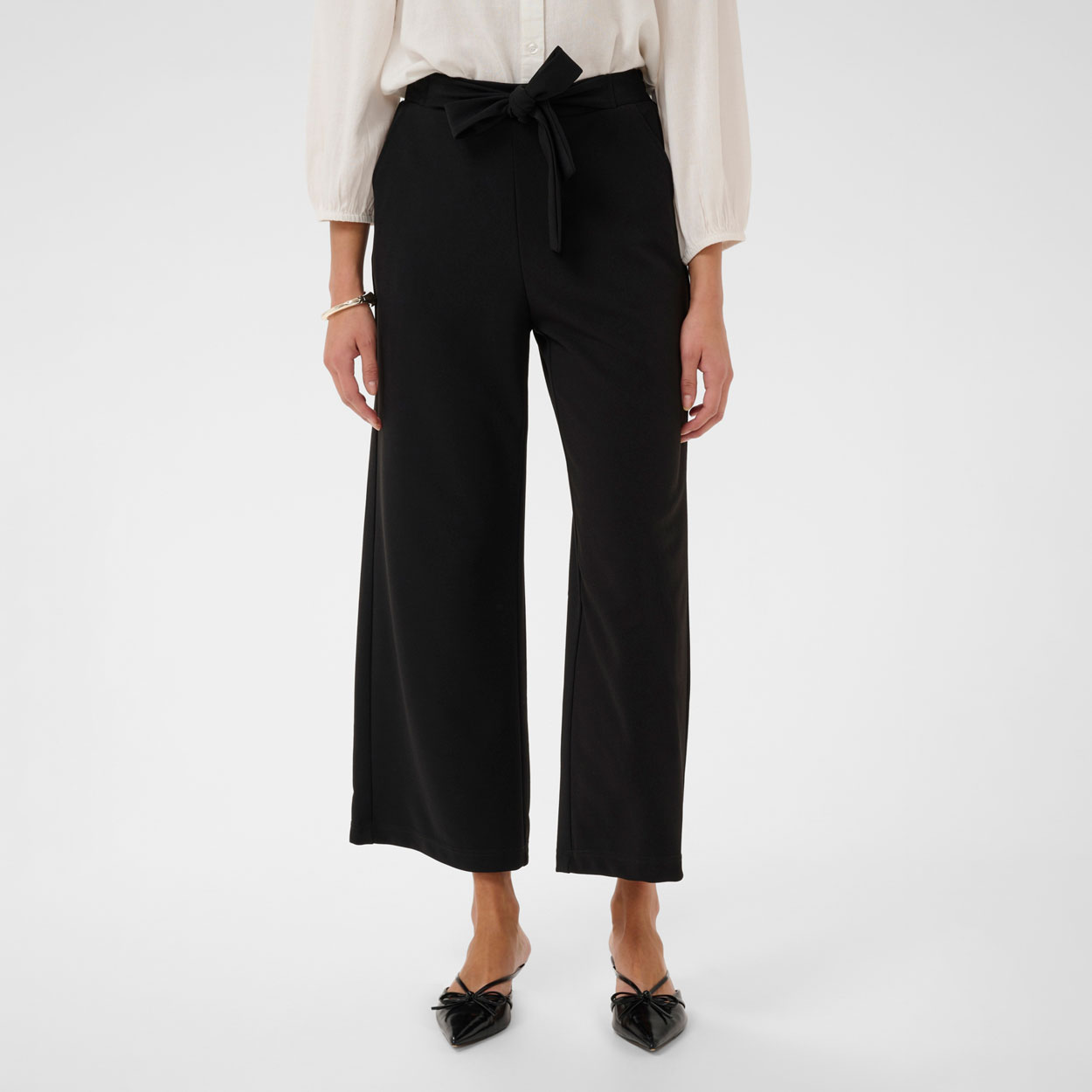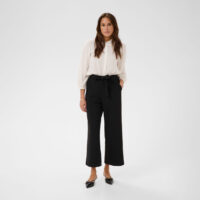 Kaffe upeat housut, leveällä lahkeella. Kaffe housussa on vajaamittaisella lahkeella. Housussa on kuminauhavyötärö ja kiinteä samasta kankaasta vyö. Phoebe housun kanssa sopii hyvin Phoebe bleiseri.