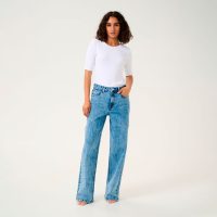 Kaffe Thora farkuissa on kauniit strassi koristeet edessä. Kaffe farkussa on korkea vyötärö. Farkuissa on leveät suorat lahkeet. upea farkku vaikka juhlaan.