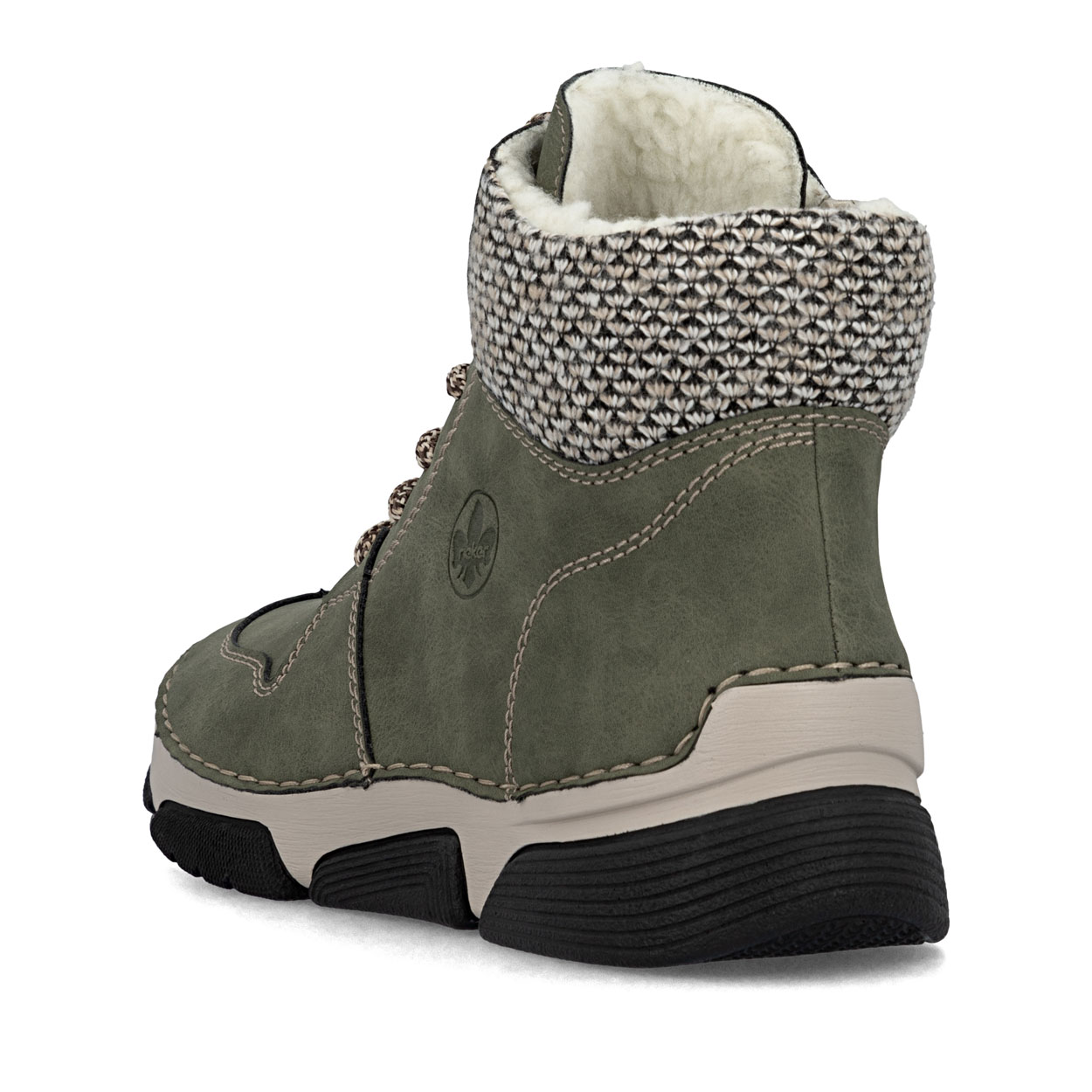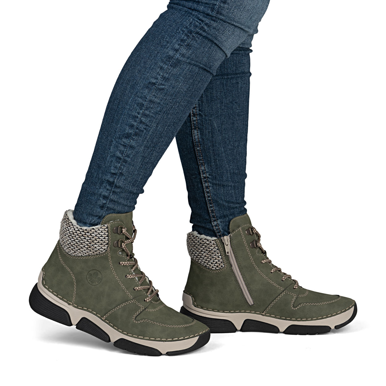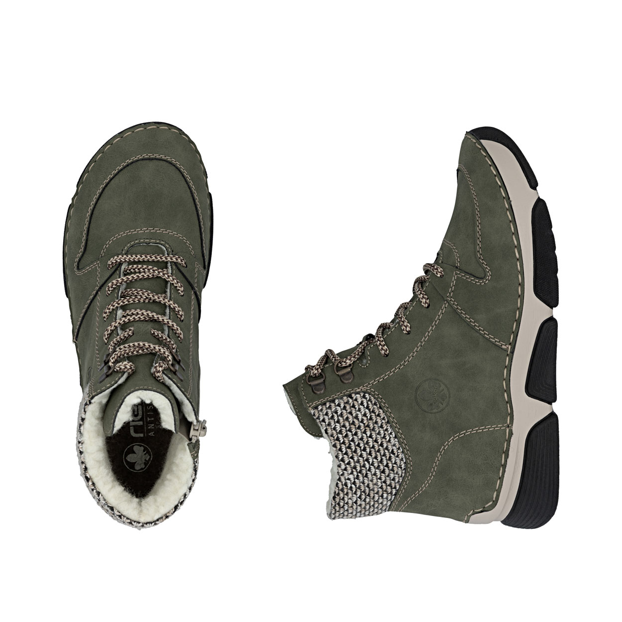 Rieker naisten tyylikkäät ja rennot nilkkurit tennari pohjalla. Rieker nilkkurissa on pehmeä antistress pohjallinen. Nilkkurin varressa on kaunis koriste ja nauhat samaan värimaailmaan