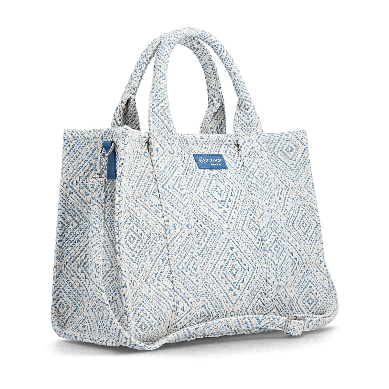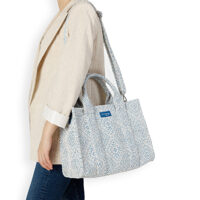 laukussa on koristeena runsaasti sini-hopea lankaa